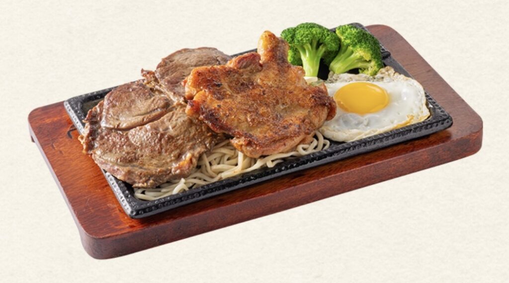 牛排加雞腿,一次擁有雙重口感的豪華雙拼。沙朗牛排肉質鮮嫩帶嚼勁,鐵板高溫鎖住肉汁與香氣;迷迭香雞腿排以獨家香料醃製,外皮煎至金黃酥脆,內部仍保有多汁彈性,香氣清爽不膩。一份就能同時享受牛肉厚實與雞腿酥嫩的層次感。