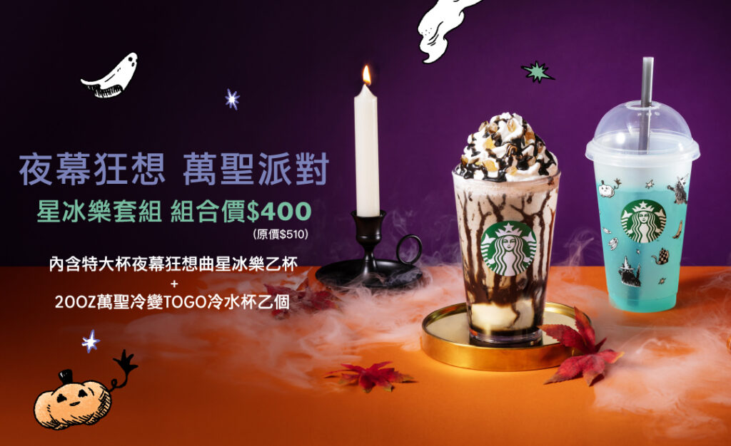 - 活動內容:星冰樂套組 組合價$400(內含特大杯夜幕狂想曲星冰樂乙杯 + 20OZ萬聖冷變TOGO冷水杯乙個)