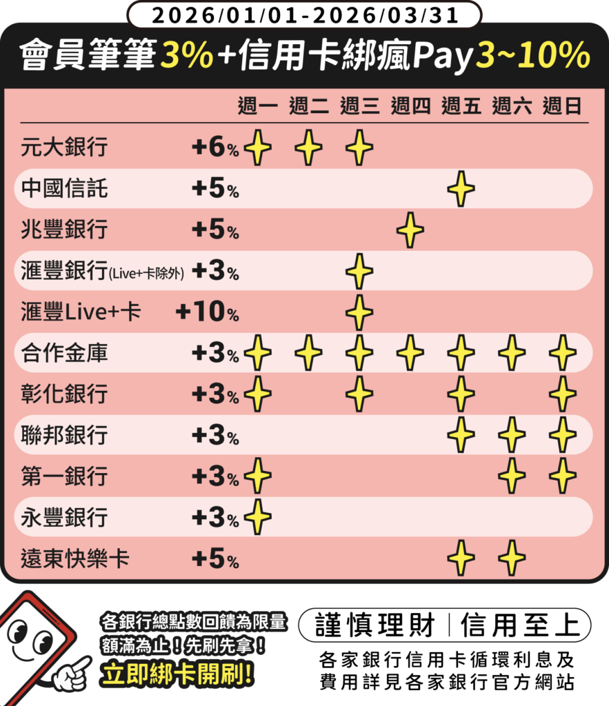 2026 瘋 Pay 拿點數開跑,只要將各家銀行信用卡綁定王品瘋美食的「瘋Pay」行動支付,結帳時即能享有對應的回饋優惠,最高享 12% 回饋!