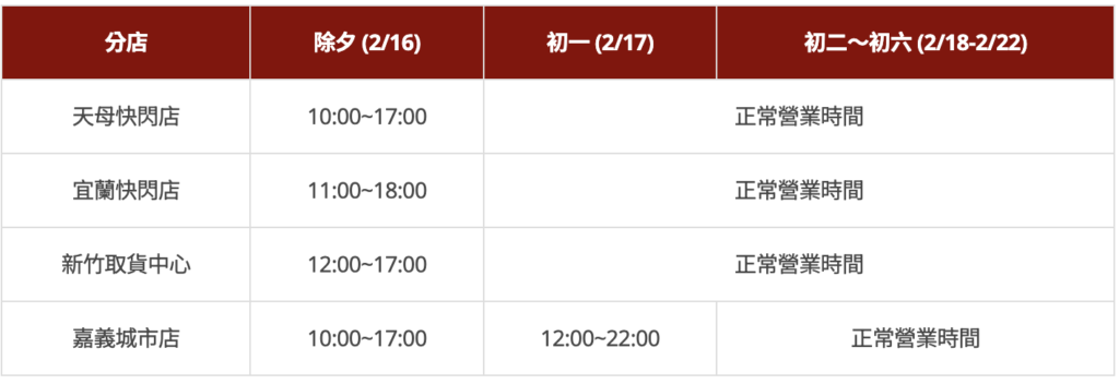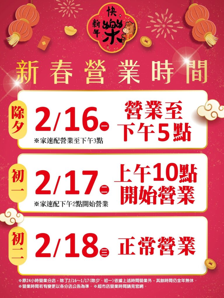- 2/17(初一)~2/19(初三)營業至21:00