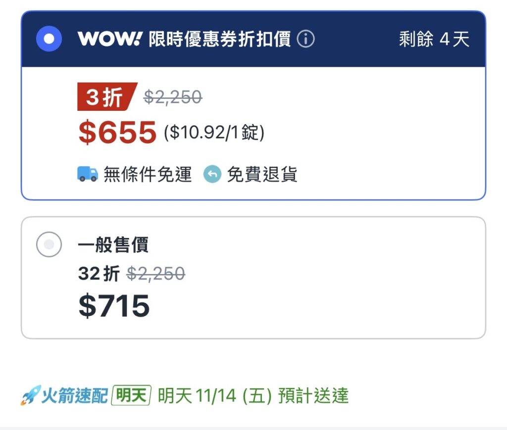 目前酷澎一直在推薦這項功能,也會使用很多手段引導消費者訂閱。例如一件商品出現「WOW! 現時優惠券折扣價」,而且還是預設選項,點進去才發現要加入會員才可以獲得優惠券,有些人可能不知不覺中就成為會員。這點需要特別留意。