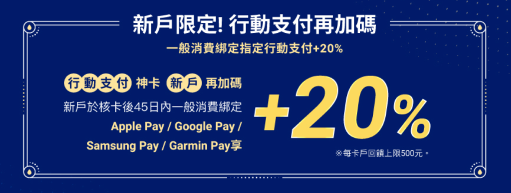 - 將一般消費綁定指定行動支付付款,即可享 +20% 刷卡金(回饋上限500元刷卡金)