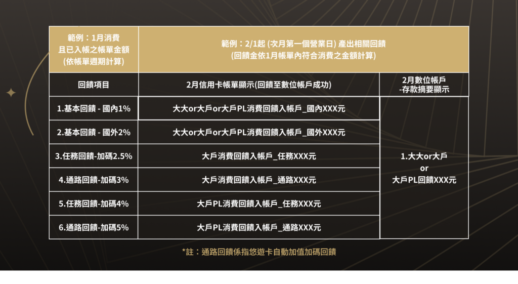 - 大戶 Plus 等級:5% 回饋,上限 NT$500/月帳單週期