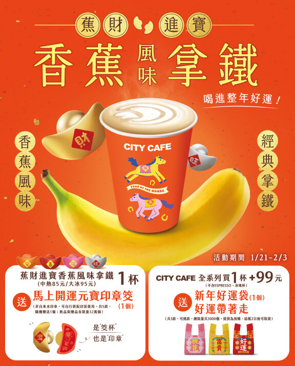 7-11 自 1 月 21 日起開賣全新「蕉財進寶香蕉風味拿鐵」,中杯熱飲 85 元、大杯冰飲 95 元,將濃厚香蕉香氣與滑順拿鐵結合,帶來新年限定風味。凡購買任一杯,即可免費獲得「馬上開運元寶印章筊」1 個(共 5 款隨機:好運、財運、成功、安康、戀愛),兼具擺飾與擲筊祈福功能,並隨袋附贈 OPEN 祝福小卡,搭配印泥即可蓋印祝福語。此外,購買 CITY CAFE 全系列任 1 杯,加價 99 元即可換購「馬上開運新年好運袋」,3 款造型可自由選擇。