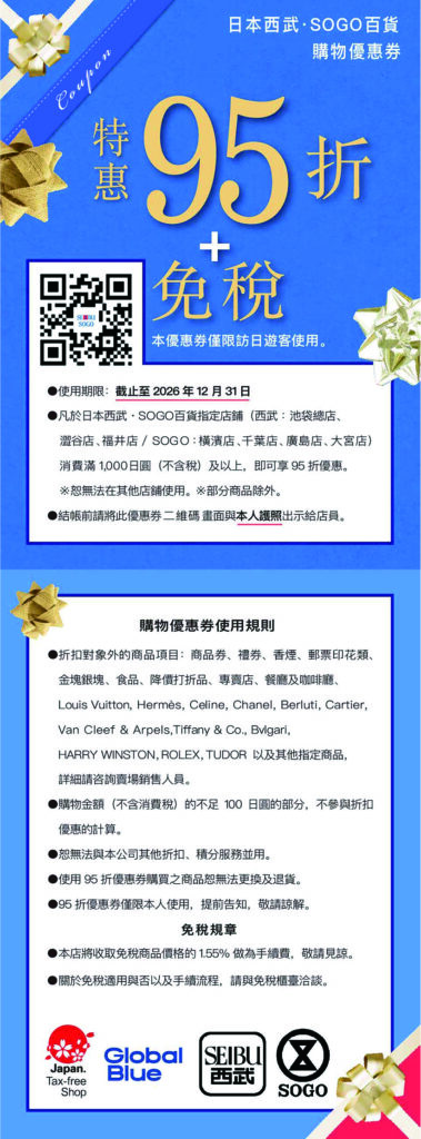 適用店面:西武百貨(池袋總店、澀谷店、福井店)、SOGO 百貨(橫濱店、千葉店、廣島店、大宮店)