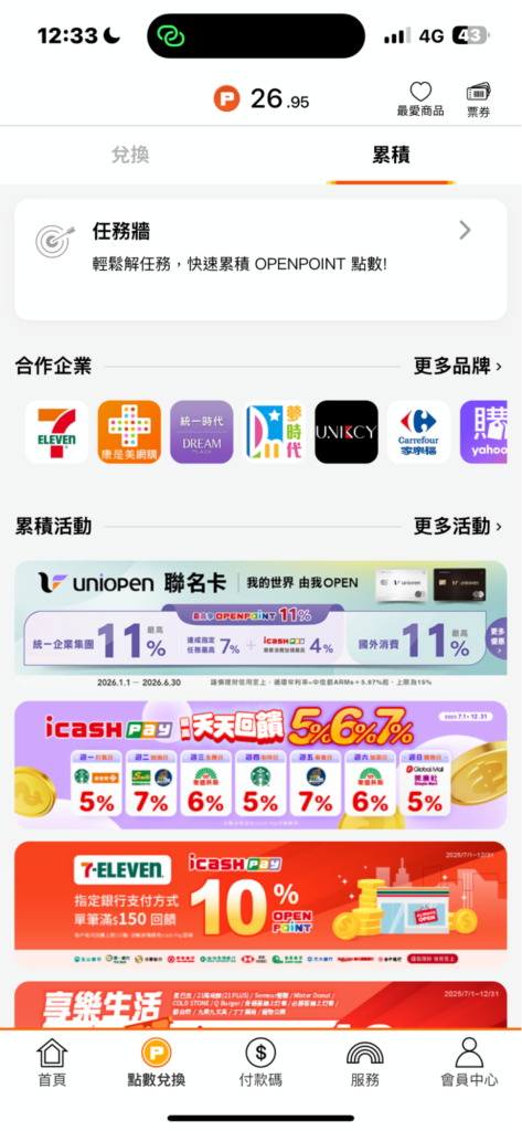 除了固定消費所累積的點數外,OPENPOINTS 也會不定期推出各式行銷活動,例如期間限定的加碼送點、指定任務完成回饋,或與特定品牌合作的專案活動,這類活動通常能在短時間內快速累積點數,但同時也伴隨較短的使用期限,適合有明確消費計畫的使用者參與,可在 OPENPOINTS APP 中查找活動與賺點任務。