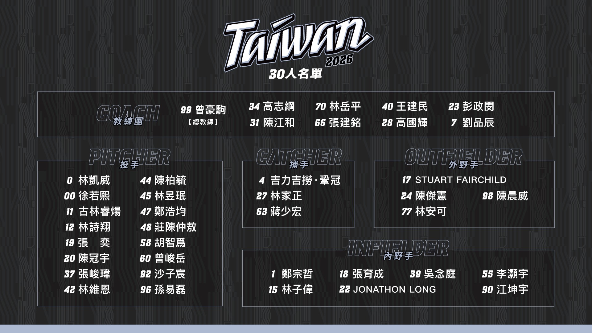 本次中華隊由中華職棒與旅外精英組成最強陣容,力求突破預賽重圍。以下為目前的正式名單: