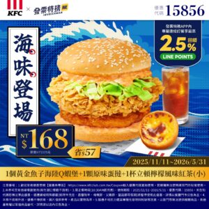 1個黃金魚子海陸Q蝦堡+1顆原味蛋撻+1杯立頓檸檬風味紅茶(小)=$168 |