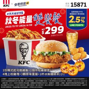 1份韓式起司脆雞飯+1個咔啦雞腿堡+4塊上校雞塊+3顆原味蛋撻+1杯冰無糖綠茶(小)=$299 |